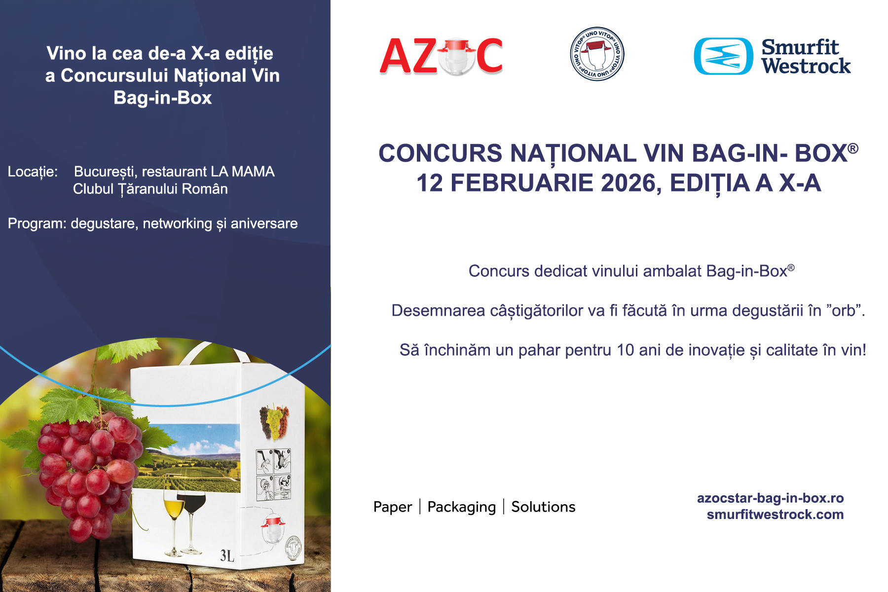 Pentru cel de-al X-lea an consecutiv, AZOC-STAR SRL organizează Concursul Național Vin Bag-in-Box, în data de 12 februarie 2026. Concursul va avea loc în Bucureşti, strada Monetăriei nr. 3 la restaurantul LA MAMA – Muzeul Național al Țaranului Român.